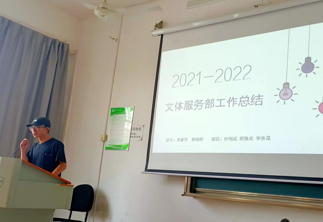 此次会议由甘文涛、王若嫣共同主持。各部门成员代表依次对2021-2022年度的工作进行了汇报和总结。报秘书处汇报了其部门主要负责每周例会相关事宜、院内或者学校颁布任务的人员安排、学院官方QQ的运营、学生会的资金流动以及上学期的年终表彰大会的主持。学习服务部讲述了本学期中学习服务部主要负责每两周一次的周周五百行的发布和统计,在2021至2022年上学期一共发布了8次周周五百行,2022至2023下学期至此发布了7次。生活服务部工作汇报了这一年中他们部门负责了“特色寝室”的创建活动,及优秀寝室的展示。实践服务部汇报乐其部门在这一年中负责了拉取社团赞助,篮球赛事的照片拍摄,策划案的撰写,还举办了电信防诈骗短视频的活动。权益服务部讲述了在这一年中他们部门主要负责了学生会成员考核的量化积分表的统计、篮球赛的围场和散场的工作、社团活动开展前教室的借用、协助实践部共同完成学院人大代表的选举活动、协同校会一起对跳蚤市场的举办进行维护。文体服务部对其部门在这一年中负责的大小活动进行了讲述和总结,包括了大一新生的升旗仪式的通知、新生杯篮球赛的举办、合唱比赛、舞龙和广播操的活动。
