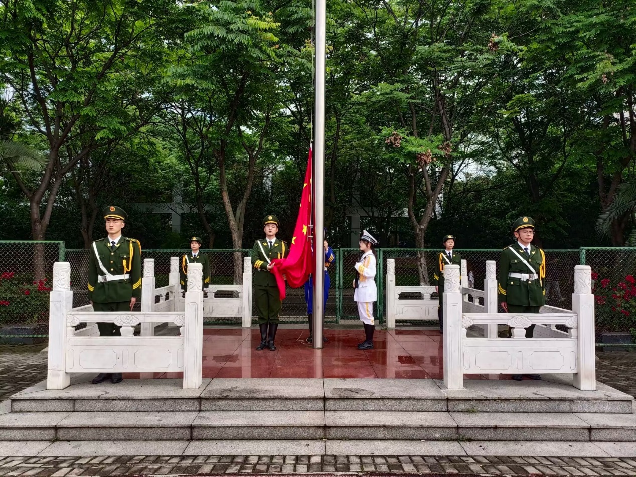 七点升旗仪式准时进行,现场随着仪仗队的出现而安静下来。庄严的仪仗队护卫着国旗走入场内,国旗护卫队的队员迈着整齐的步伐护送国旗入场。伴着庄严嘹亮的国歌,五星红旗冉冉升起,全体师生怀着崇敬与喜悦的心情,对着迎风飘扬的五星红旗行注目礼,心中无比自豪。