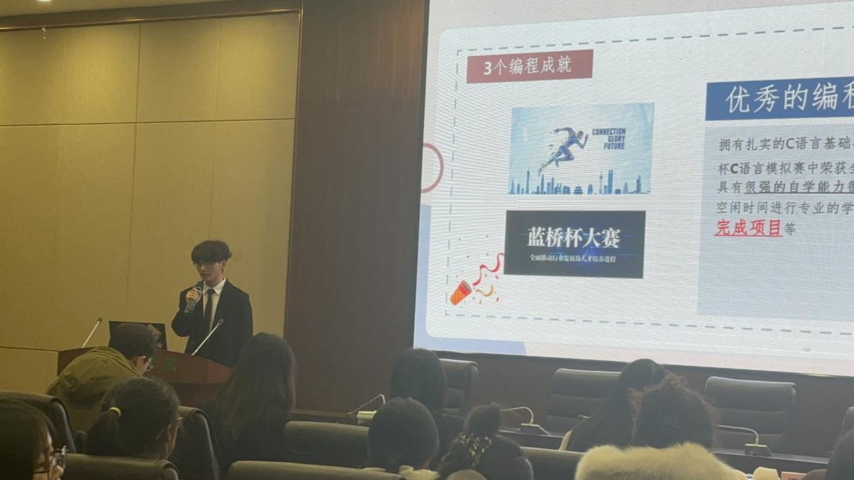 在决赛现场,宋林同学围绕“物联网工程师”这一职业方向进行深入宣讲。他从职业背景、行业发展趋势、个人优势分析到未来规划目标进行了全方位阐述,内容逻辑严谨、条理清晰,充分展现了他对物联网行业的深刻理解以及作为新时代大学生的责任感与使命感。他的出色表现不仅展示了个人的职业规划能力,也体现了我院对于大一新生专业教育的结果。