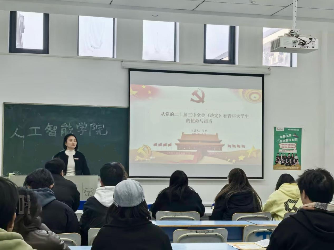 (通讯员 吴艳 吴雅雅)12月8日,人工智能学院党总支书记吴艳在15栋322教室为学生党员带来了一场深入浅出的“二十届三中全会精神”学习讲座。此次讲座旨在深入学习贯彻中国共产党第二十届三中全会通过的《中共中央关于进一步全面深化改革,推动中国式现代化的决定》,帮助学生党员准确理解和把握全会精神,特别是“七个聚焦”以及全会对进一步全面深化改革的系统部署。