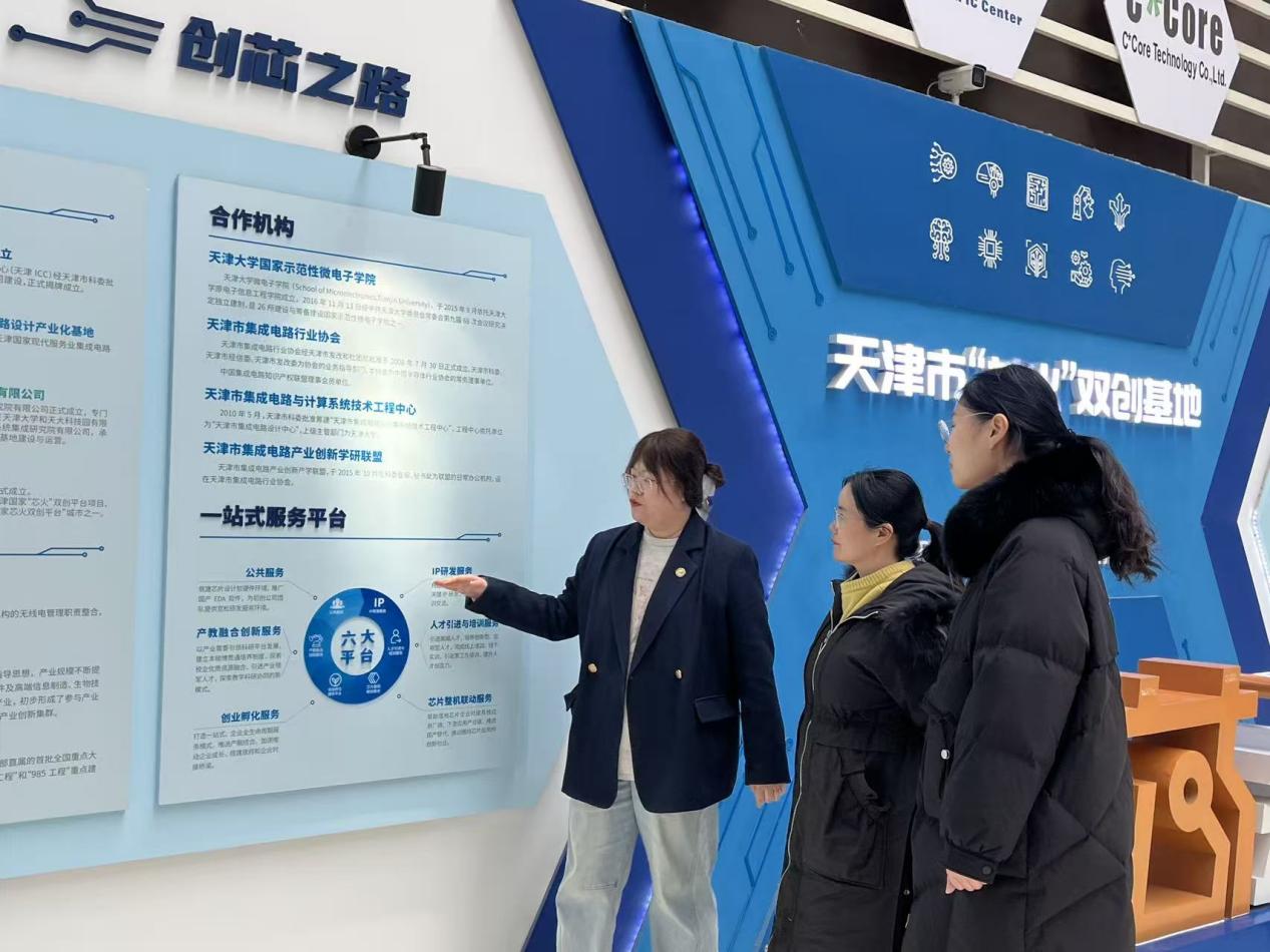 创业孵化与产业延伸板块同样令人瞩目。基地二楼及以上楼层均为孵化空间,每年计划推进5-10家集成电路及交叉学科相关企业孵化,依托天津市海河基金提供2亿元天使轮投资支持。老师一行参观了两家由天津大学孵化的优质企业——芯灵通(天津)科技有限公司、天津海芯微电子技术有限公司,其中芯灵通团队已斩获中国国际大学生创新创业大赛金奖,其研发的5G毫米波芯片、射频芯片等产品已应用于工业自动化、军工、养老院定位等领域,与中国移动等下游企业达成深度合作,展现了产教融合的丰硕成果。