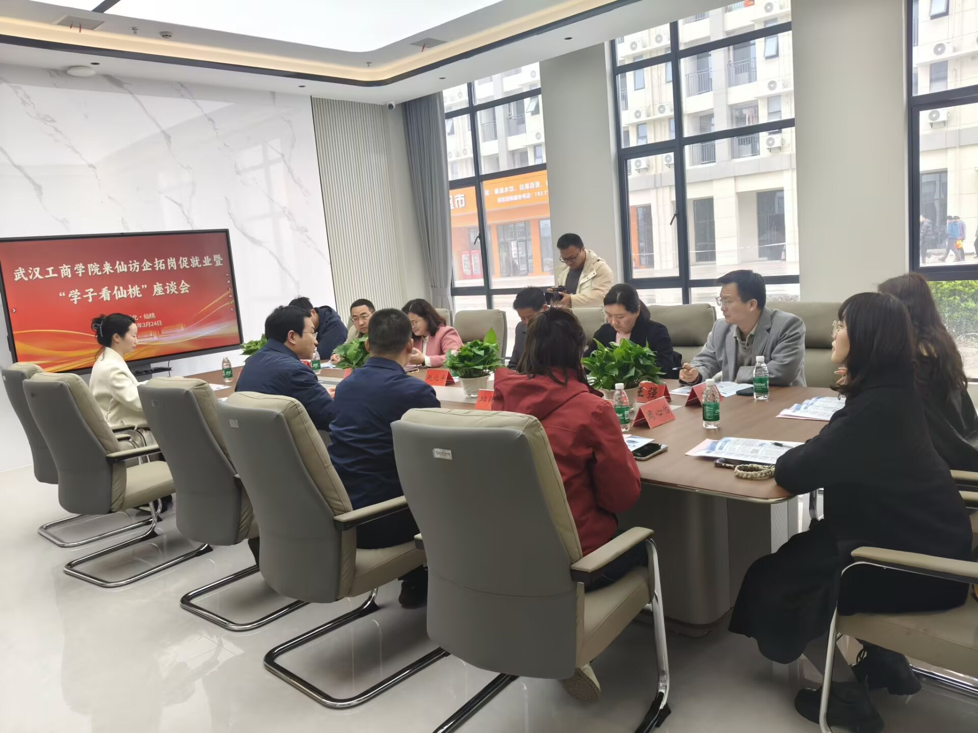 随后,校地合作座谈会在职业工装电商产业园会议室举行。仙桃市人社局领导详细解读了当地的人才引进政策,重点介绍了“沔才卡”等涵盖生活补贴、创业扶持的系列优惠举措,表达了对学校优秀毕业生到仙桃建功立业的诚挚邀请。