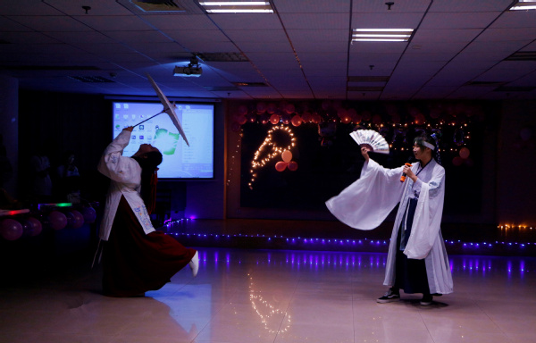 茶话会在广播台成员们共同表演的舞蹈串烧中拉开帷幕,青春活力的舞蹈、带有节奏感的旋律带动了全场的氛围。晚会一开始,首先为广播台评选出的上学期16名优秀台员颁奖,紧接着同学们各展才艺,歌曲串烧、小品、配音秀、影子戏等表演轮番上演。其中,其中最让人惊叹的莫过于是反串小品《倩女幽魂》,它以电影《倩女幽魂》为素材,讲述了女鬼小倩和宁采臣之间的搞笑爱情故事。小倩的反串表演者的表现是全场最佳笑点,诙谐的话语、夸张的动作、演员之间默契的配合更是掀起了茶话会的高潮。