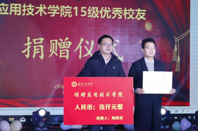 大会第二项,捐赠仪式。2015级优秀毕业生梅辉武为学院捐赠伍仟元,用于帮扶学院困难学生。梅辉武感谢学校、学院对他的培养,他用自己的亲身经历告诫在场的学弟学妹们在校期间要认真学习、积极进取,为将来实习就业打下坚实的基础;到工作岗位上要勇于拼搏、敢于奉献,将应用技术学院的优良传统发扬光大,要努力为母校为学院增光添彩。他告诉学弟学妹们如果有任何关于实习或工作方面的问题都可以与他探讨。他的发言赢得了在场师生的阵阵掌声。院长金学武对梅辉武的此举表示衷心的感谢,并表示学院一定将资金妥善保管,合理使用。