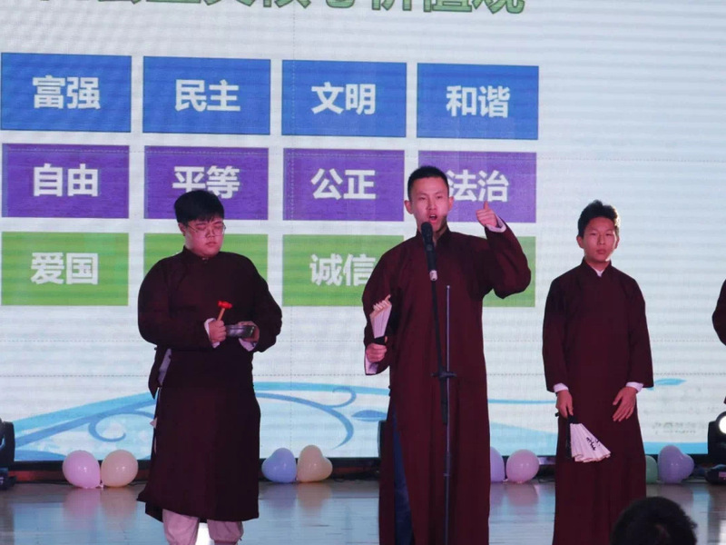 由入党积极分子带来的《三句半》又一次将晚会推向一个小高潮。四名位同学将社会主义核心价值观基本内容的24个字用脍炙人口、通俗易懂的话语来进行解读,找准了与在场师生思想的共鸣点,做到了贴近性、对象化和接地气,以大家喜闻乐见的方式为在场的师生上了一次思想政治课,让大家接受了一场思想洗礼。