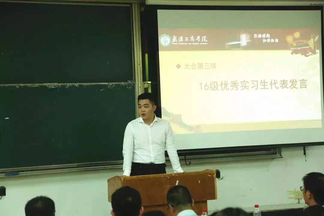 16级国际经济与贸易实习生代表李祺上台发表讲话。他以自身的实习经历,建议学弟学妹们:“大学生步入职场,一开始最重要的并不是赚钱,而是学会积累工作经验,学会为人处世,学会担当。”