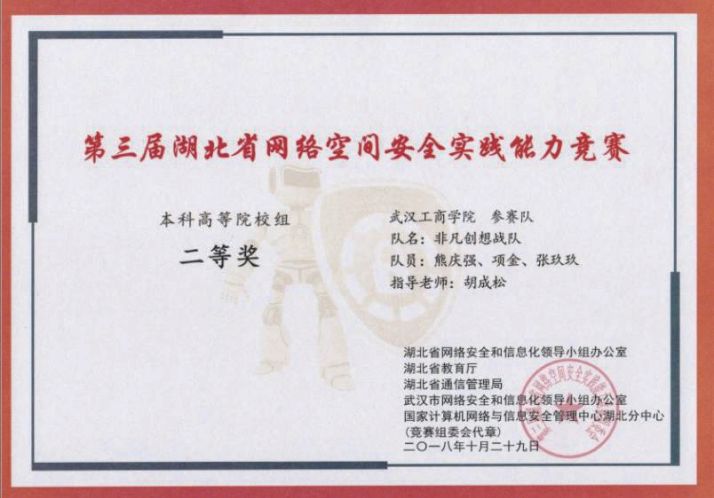 在2018年第三届湖北省网络空间安全实践能力竞赛中,应用技术学院学生团队(熊庆颂、项金、张玖玖)荣获二等奖。