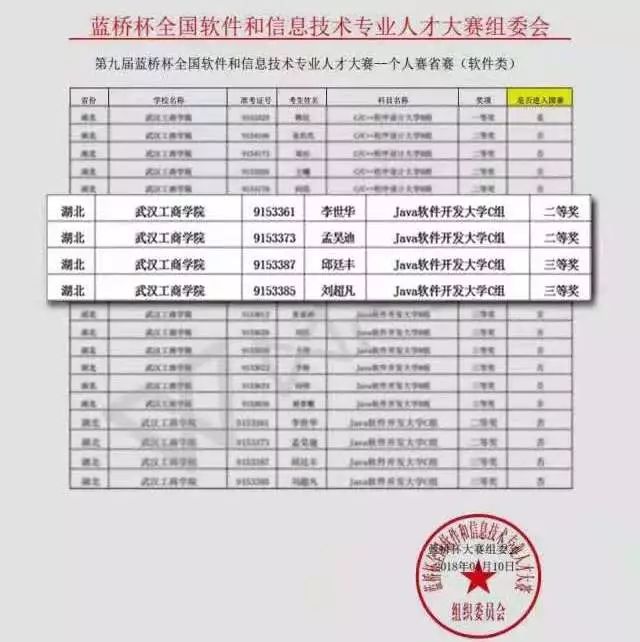 2019年由工业和信息化部人才交流中心举办,教育部就业指导中心高度支持的第十届“蓝桥杯大赛”中,应用技术学院学子取得优异成绩:袁鑫杰、李子牧分别荣获蓝桥杯全国总决赛三等奖和优秀奖,且均获湖北省省赛一等奖;段文宇、吴杰等两名同学荣获湖北省省赛二等奖;徐桎韦、王立松、王昌杰、叶陈琛、黄兴意、肖凯等7名同学三等奖。