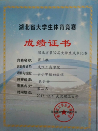 在工作上,作为武术社组织部部长,策划组织各项活动,与社团成员一起参加省级、校级的各项武术比赛和表演活动,获得“第32届大学生武术比赛女子甲组初级棍第二名”、“湖北省第15届运动会女子甲组自选刀术第四名”、“BB贝博艾弗森官方网站第一届‘黄家湖’杯武术比赛三路长拳第一名”等荣誉。