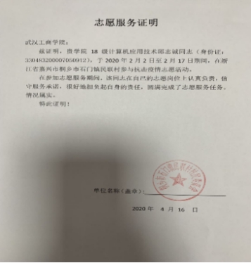 在疫情期间,作为一名学生党员,为了履行自己在入党时的誓言;做好自我隔离,在潜伏期结束之后,积极下沉到当地社区参加志愿工作,和社区工作人员做好返乡群众的隔离和监察,在志愿点劝返出门群众,配合工作人员做好对居民体温的检测工作,并协助当地青年志愿者为医院搬运抗疫爱心物资,在长达28天的志愿工作中,尽心尽力、任劳任怨地为社区居民服务。在得到血库告急的消息后,前往当地血站捐献血300cc,并以个人名义捐款100元。