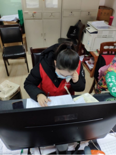 2月13日,被社区分配至办公室做居民信息录入工作,后因一线人员紧张开始卡口值守,在2月19日,成为6栋3个单元的楼栋长,每天除了五个小时的值守之外,还需要每天上门入户监测,进行一次上门排查,了解掌握每家每户家庭成员的健康情况。对公共活动区域定期进行消毒杀菌,对老弱病残、独居老人、生活困难的群众运动生活物资,发放爱心蔬菜。