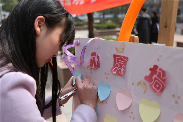 “我希望今年能够成功瘦身!”“我想找到满意的兼职工作,赚生活费”在心愿墙前,很多女生在男生们为她们准备的爱心贴纸上写下自己的心愿。