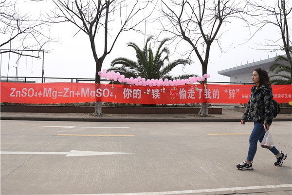 除了这些仙气十足的创意标语,该校部分学院还挂出了一些与学院所开设的专业相关的创意横幅,环境与生物工程学院学生会就挂出了“ZnSO4+Mg=Zn+MgSO4,你的‘镁’偷走了我的‘锌’”的创意横幅,受到了同学们的热捧和好评。