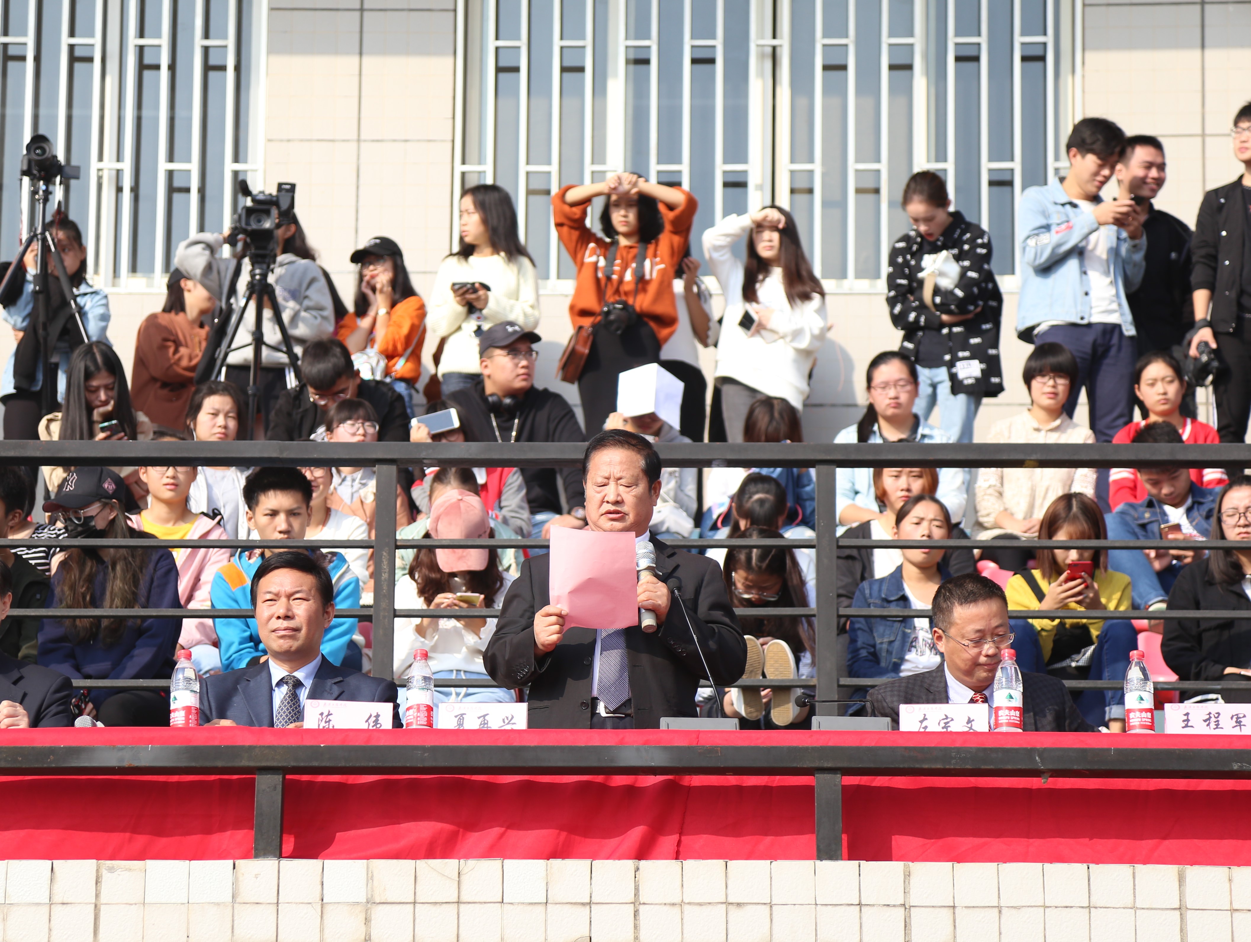夏再兴致副校长致开幕词,他说,一年一度的田径运动会,是学校的体育盛事,是学校贯彻落实全民健身计划、积极实施阳光体育运动、增强师生身体素质、全面实施素质教育的一次大检阅。本次运动会以文明、友谊、拼搏、向上为宗旨,努力发扬拼搏、进取、有爱、互助的精神,重在参与,赛出风格,赛出水平。