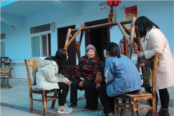 学生志愿者陪养老院的老人聊天 摄影赖鹏