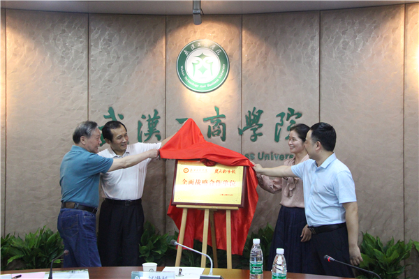 赵洪松总编辑、江萌总经理与彭秀春董事长、张金海院长共同为“BB贝博艾弗森官方网站、楚天都市报全面战略合作单位”揭牌。