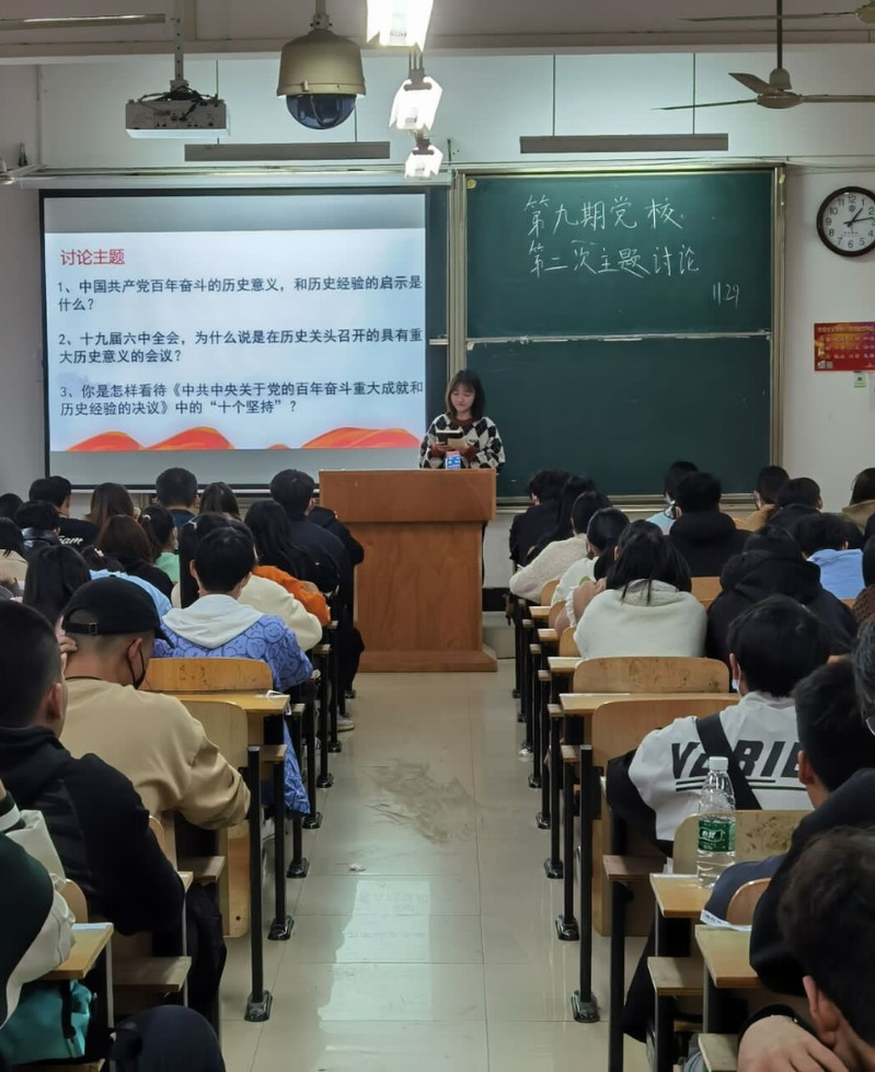第四次党课是主题讨论。各入党积极分子分别对以下三个主题进行了讨论。一、中国共产党百年奋斗的历史意义和历史经验的启示是什么?二、十九届六中全会,为什么说是在历史关头召开的具有重大历史意义的会议?三、你是怎样看待《中共中央关于党的百年奋斗重大成就和历史经验的决议》中的“十个坚持”?此次讨论由后12小组分享。经过15分钟的激烈讨论,各小组各抒己见,台下同学认真聆听,细致做笔记,掌声雷动。