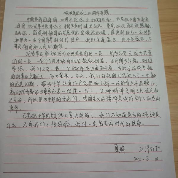 如今,曾是共青团员的我已经成长为一名预备党员,在为实现共产主义而奋斗的道路上,我又前进了一步。我相信,还有许多人和我一样,曾经都想争做优秀的共青团员,在经历过共青团的洗礼与培养下,我们都已成长为充满激情和活力的青年。“ 我们是五月的花海,用青春拥抱时代;我们是初升的太阳,用生命点燃未来。”做一名优秀的共青团员,也许我们很普通,只是大海中的一滴水,只是万亩森林中的一片叶,但我们一样要升华,一样要释放人生的光和热。我们要在鲜红的团旗下,尽情挥洒我们的热血青春。
