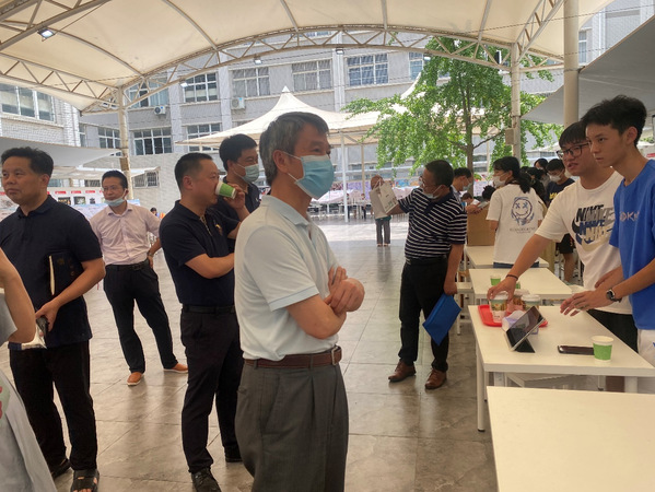 应用技术学院学生的作品——“反诈宣传小助手”也进行了参展,13日,学校校长孔建益、党委书记刘生元等领导也来到现场观看学生们的作品。本项目展现学生紧贴区域产业实际、服务地方经济社会发展所取得的科技创新成果,引导学生面向实践钻研创新,提升责任意识、应用能力和创新素养。
