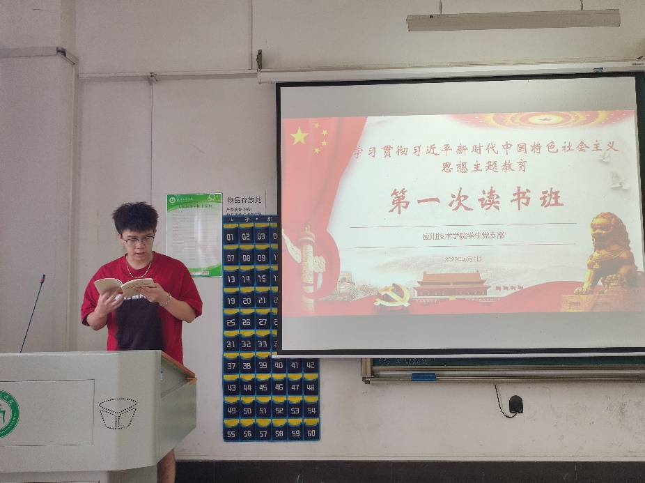 2023年6月21日中午12:20,应用技术学院学生党支部组织学生党员于综合楼306教室开展学习贯彻习近平新时代中国特色社会主义思想主题教育读书班。