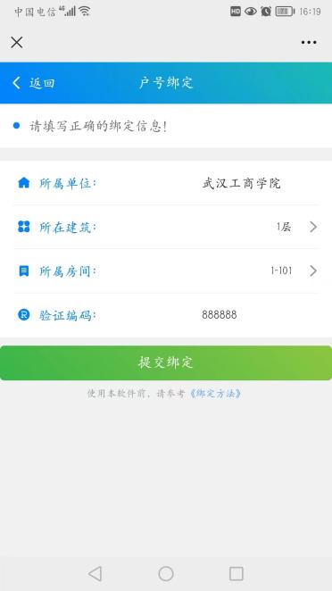 三、提示框选择“确定”;所属单位填写“BB贝博艾弗森官方网站”;所在建筑选择“楼栋和楼层”后确定;所属房间选择“房间号”后确定;验证编码输入“888888”后提交绑定;
