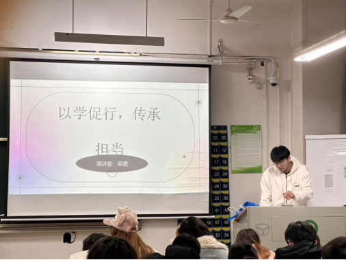 班会一开始,梁鹏同学首先发表了热情洋溢的致辞。他强调了学习与实践相结合的重要性,鼓励同学们不仅要学好书本知识,更要关注社会、关心他人,用实际行动诠释“以学促行,传承担当”的主题。