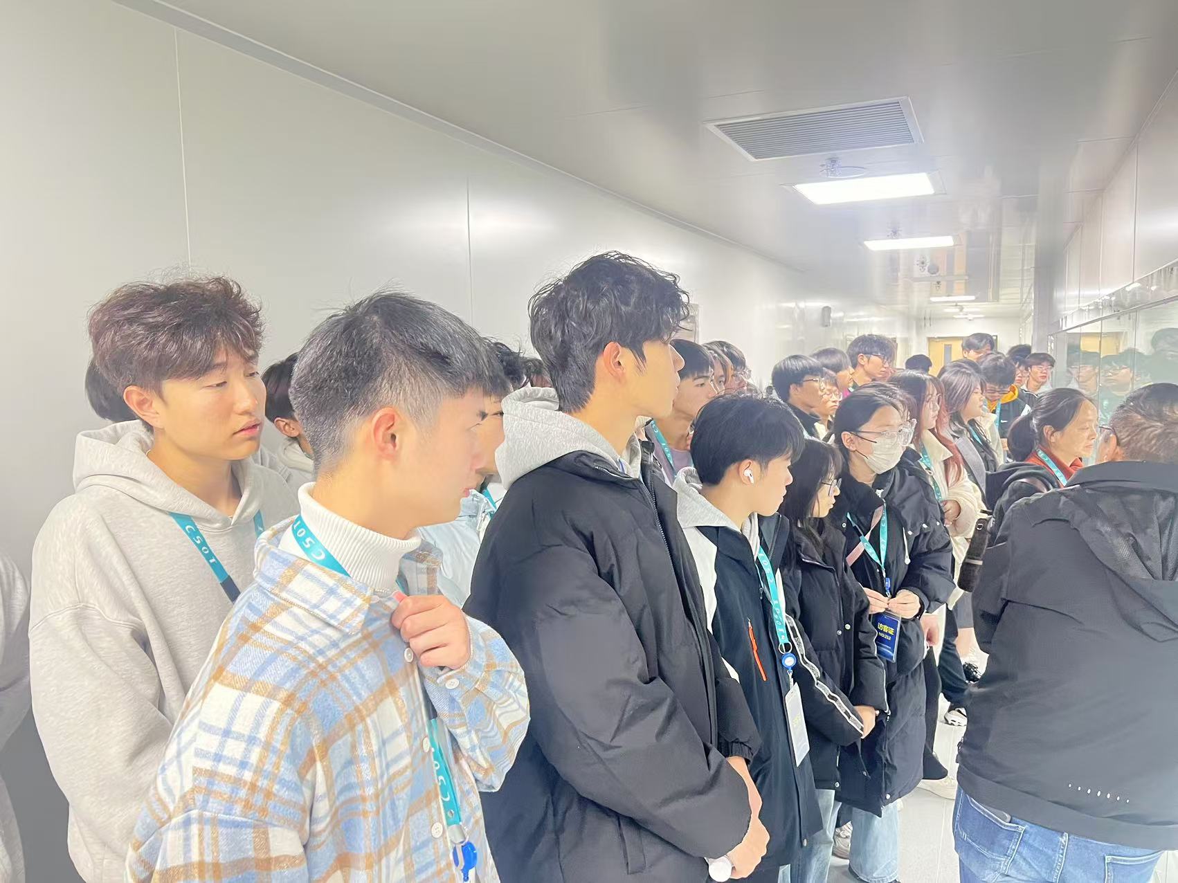 随后,学生们分成两组有序进入了T3、T5生产参观通道进行实地观摩。在这里,他们亲眼目睹了高度自动化的生产线上,先进的光刻设备、薄膜沉积设备以及精密的检测仪器有条不紊地运行着,稀疏几个技术员和工程师在检查数据、维护设备,每一个环节都彰显着科技的力量与工业制造的魅力。企业工程师们耐心地为学生们讲解生产流程中的关键技术和质量控制要点,让他们对电子信息产品的制造过程有了更为清晰、深入的认识。面对学生们提出的关于生产工艺、设备原理以及技术创新等方面的问题,工程师们都给予了专业而细致的解答,现场互动气氛热烈。