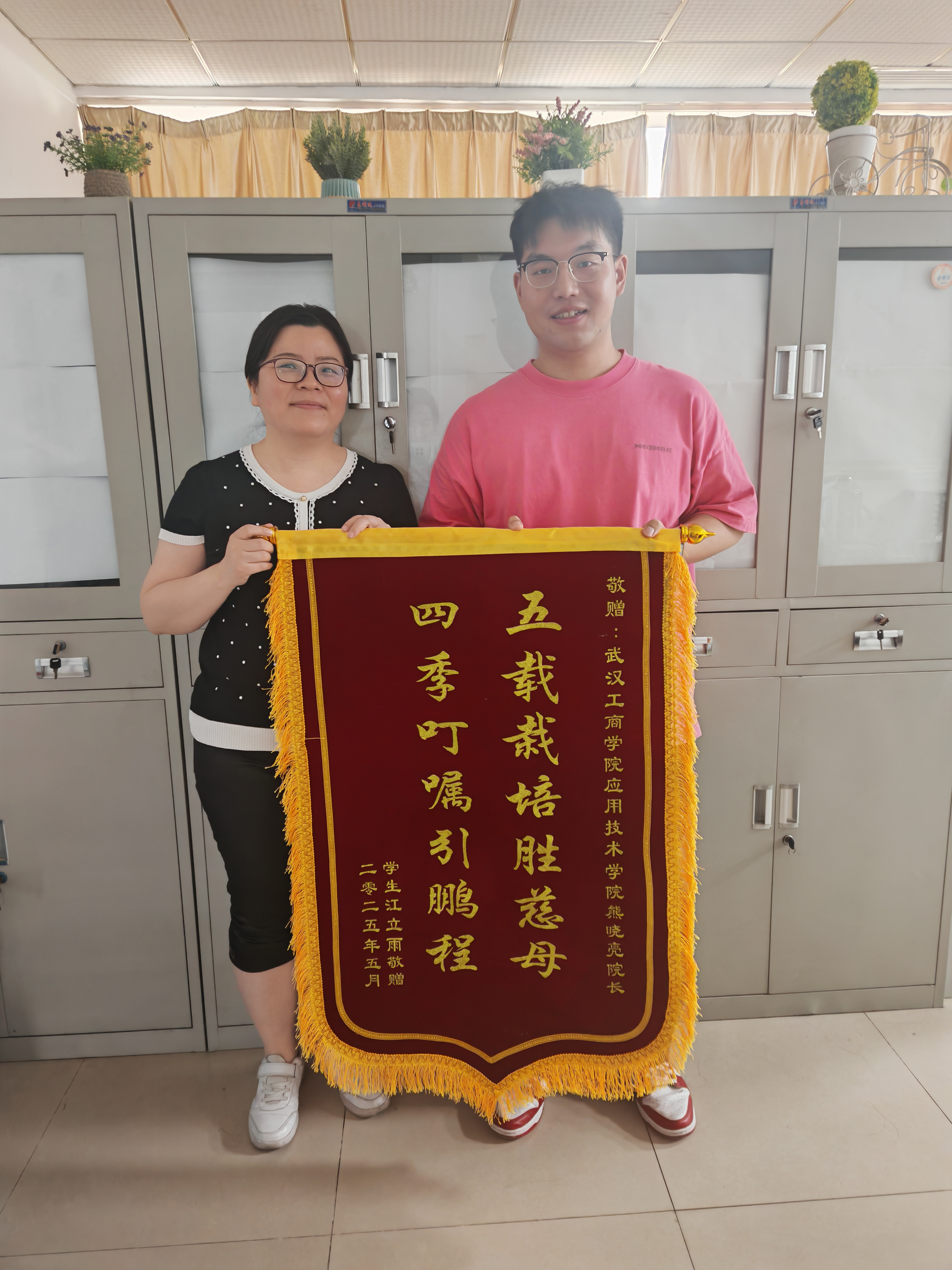 在学院走廊的绿植映衬下,江立雨身着简洁的粉色T恤,将首面锦旗郑重递予金学武院长时,锦旗上“春风化雨润桃李,明德惟馨育栋梁”的金色大字熠熠生辉,这十八个字既是学子对师者传道授业的礼赞,更承载着寒门学子逆风翻盘的奋斗史。当第二面写着赤诚之语“五载栽培胜慈母,四季叮嘱引鹏程”的锦旗交至熊晓亮副院长手中时,这位曾为学子拨开迷雾的导师眼含热泪:“看到立雨从专科起步到考研成功,这比任何荣誉都珍贵。”