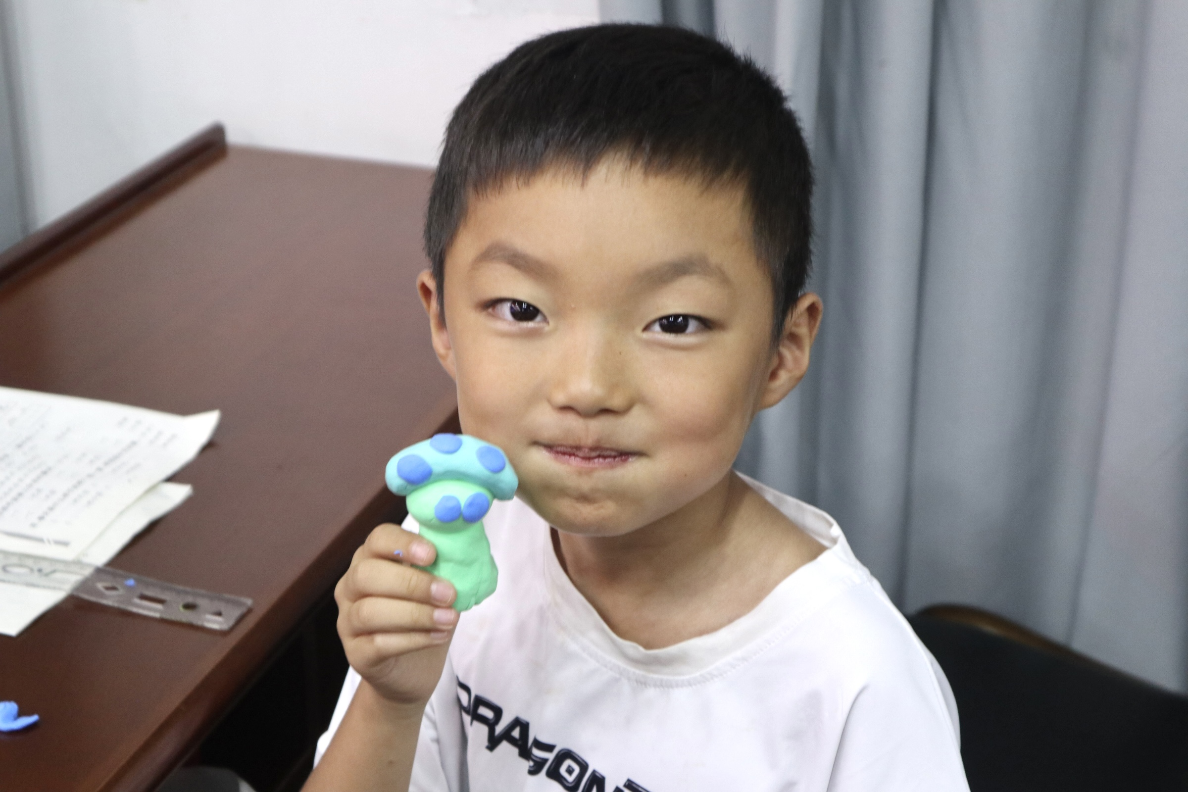 稍作休息后,由志愿者王力戈主讲的播音主持课精彩登场,他不仅细致传授孩子们发音技巧,还指导大家掌握国旗下演讲的要领。孩子们瞪着好奇的眼睛认真聆听,举手回答问题时,小手高高举起,格外踊跃。志愿者陈梦涵组织的美术课上,彩泥在孩子们手中变成了小蛋糕、小球、小蘑菇...一个个惟妙惟肖,活动室里满是成就感的欢呼。