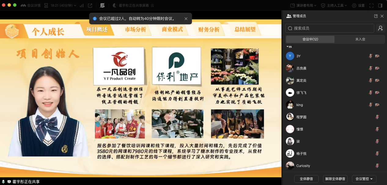 活动伊始,欧阳紫薇老师介绍赛事流程与规则,强调本次复赛聚焦项目打磨,助力选手冲刺全国赛。随后,三组选手依次讲述,“落日甜糖水铺” 团队围绕糖水铺创业项目,从市场定位、产品特色到运营模式展开阐述,展现传统糖水融合健康理念的创新思路;“茶花山庄”团队聚焦乡村文旅,呈现生态庄园的规划蓝图;“西域苁蓉・富疆兴农”团队则立足特色产业,讲述助力边疆产业振兴的创业方案。