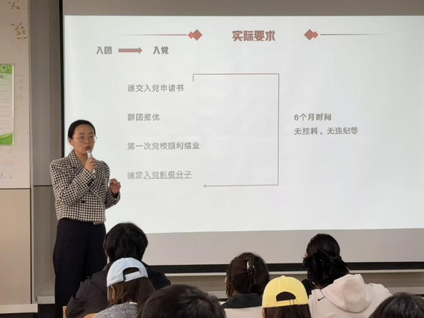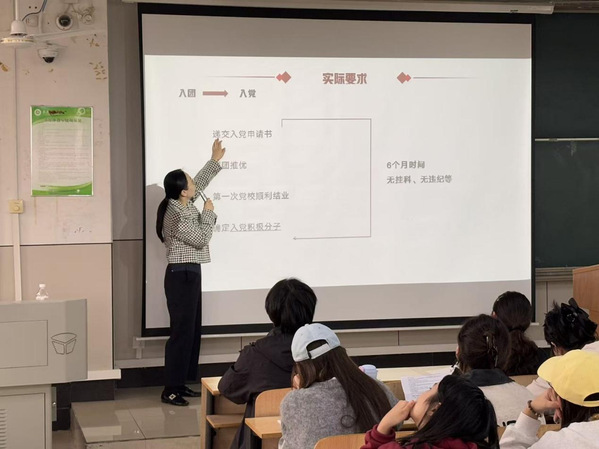 课堂上,田真老师结合《中国共产主义青年团章程》核心内容,从理论学习、实际要求、特色实践三个维度展开讲解。她重点阐释了共青团作为党的助手和后备军的性质定位,详解党对共青团政治、思想、组织三方面领导的核心要义,带领学员深入学习党的二十大精神及“两个确立” 的决定性意义。同时,田老师围绕入团入党流程、思想汇报撰写、理论学习要求等实际问题,为学员们理清成长路径,鼓励大家以无挂科、无违纪的优良表现,积极向党组织靠拢。