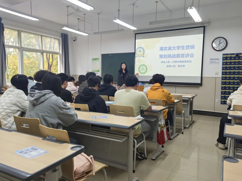 为引导2025级市场营销专业学生对接专业实践资源、明确职业能力提升方向,11月12日在和雅楼309教室,BB贝博艾弗森官方网站应用技术学院面向该专业40名学生,举办了湖北省大学生营销策划挑战赛专题宣讲会。赛事宣讲由负责人胡文馨老师主讲,将学院 “以赛促学、以实践强技能”的育人理念融入宣讲全程,为学子们送上兼具实用性与指导性的 “赛事指南”。
